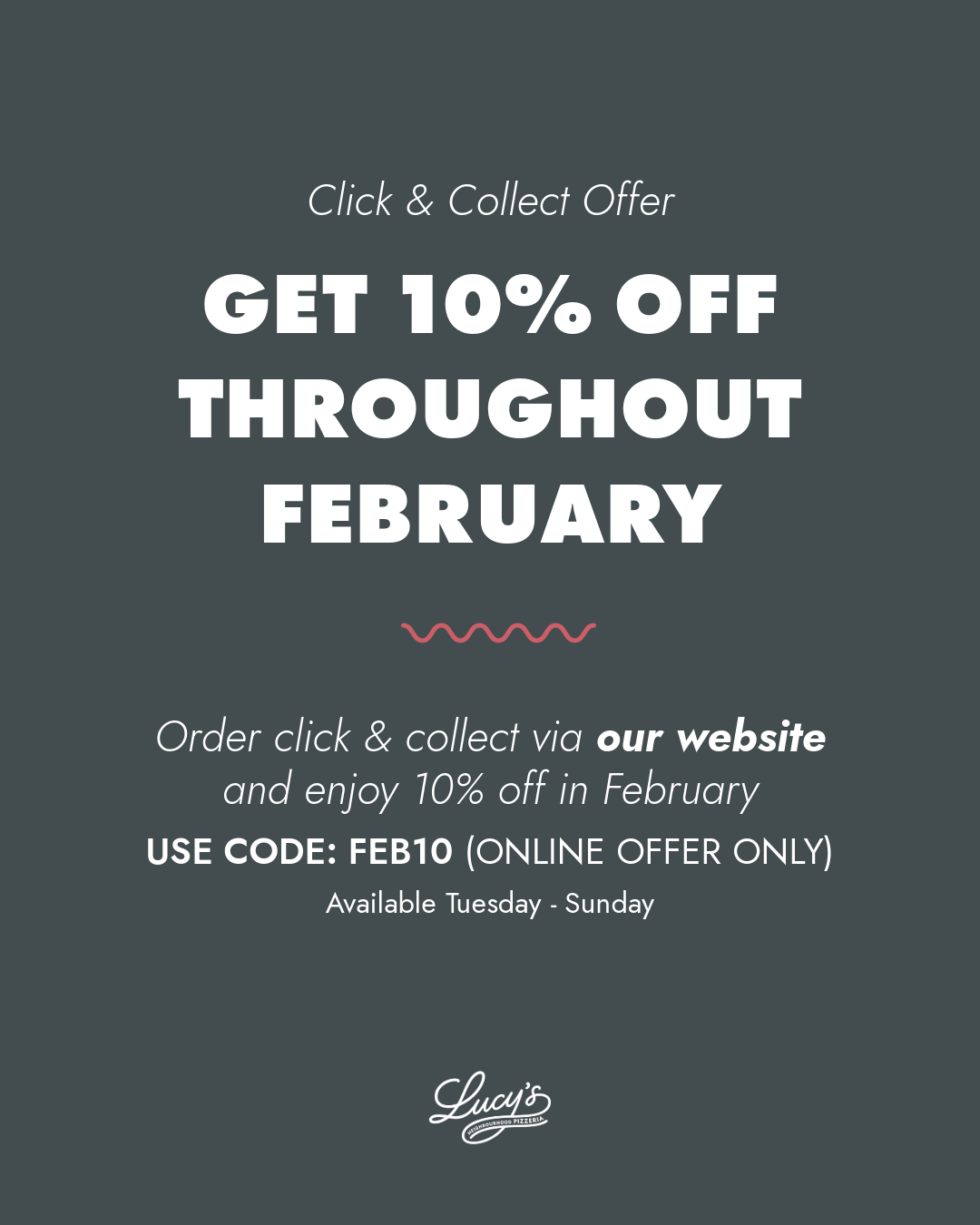 • Order click and collect with us directly and get 10% off throughout February. Available Tuesday-Sunday. USE CODE: FEB10 when placing orders online.